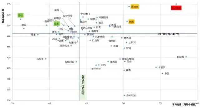 從圖6中大家可以看到,我們學(xué)生的成績最高,在右側(cè)最上角。同時,我們的學(xué)習(xí)時間也是最長的,尤其是在和芬蘭、日本這些與我們成績差異不太大的地區(qū)相比時,你會發(fā)現(xiàn)我們確實(shí)學(xué)習(xí)效率較低。我們的學(xué)生每周學(xué)習(xí)時間為57個小時,芬蘭的學(xué)生學(xué)習(xí)時間36個小時,我們整整多了21個小時。有這21個小時,我們的孩子可以做多少事情!為什么我們要把這些時間全部用在所謂的學(xué)習(xí)上?