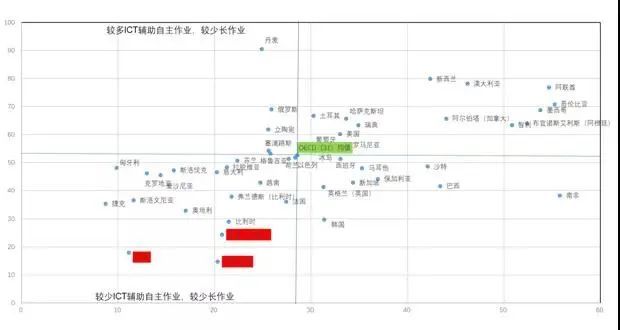 以O(shè)ECD的31個國家的均值畫一個十字線(見圖7),我們可以看到,上海、臺灣和日本是較少布置用信息技術(shù)輔助進(jìn)行的自主作業(yè)的,也很少布置長作業(yè)。與很多發(fā)達(dá)國家相比,這種特征更加明顯。這與整體教育的關(guān)注度有非常大的聯(lián)系。當(dāng)然并不能據(jù)此詬病我們的老師故意不布置這樣的作業(yè)。