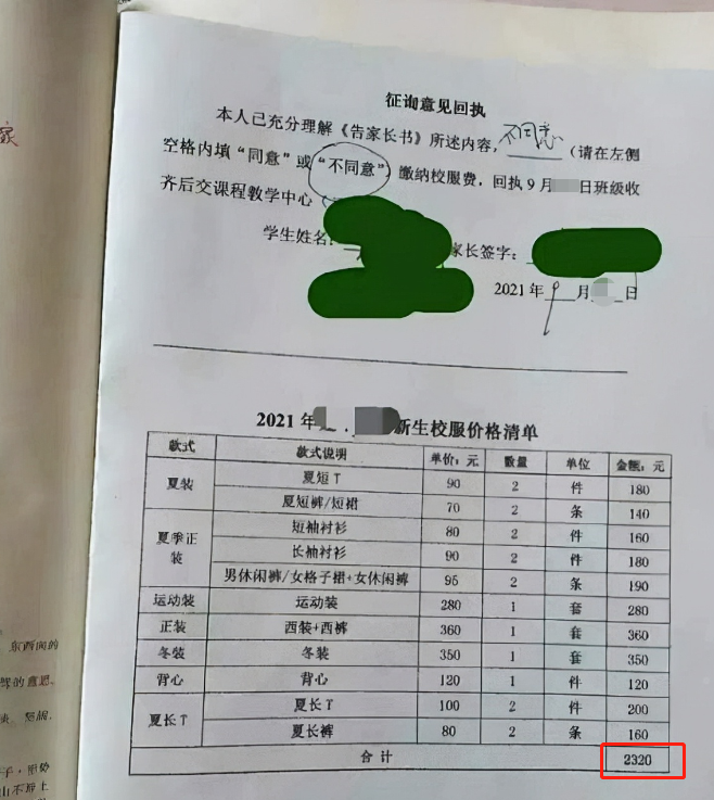 上海某?,F(xiàn)“天價校服”賬單,家長直接簽下不同意