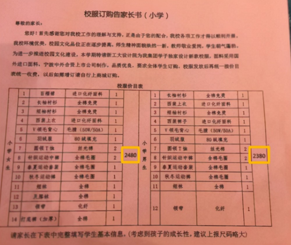 上海某校出現(xiàn)了“天價校服”賬單,從這份告家長書上,能夠看出2021年新生校服的總價格高達(dá)2320元,雖然包括的夏季和冬季還有運動裝等等,但如此高昂的價格也讓很多人感到疑惑,校服上面是繡“金線”了嗎,還是鑲金子了?一件普通的學(xué)生校服憑什么要價這么貴?