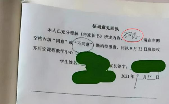 再看最后的總價(jià),2320元,這個(gè)價(jià)錢對(duì)于普通小學(xué)來(lái)說(shuō)確實(shí)是挺貴的,在正常家長(zhǎng)的眼中,校服三五百元能接受,就算是達(dá)到1000元,為了讓學(xué)生在學(xué)校不被另眼相待,也能勉強(qiáng)同意,但是2320這個(gè)價(jià)格,確實(shí)讓家長(zhǎng)有點(diǎn)接受不了,有一名家長(zhǎng)直接在通知單中霸氣回復(fù)到“不同意”。