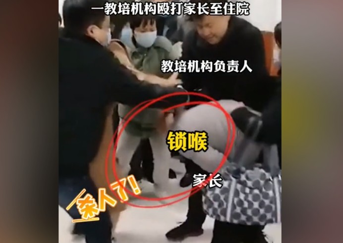 在一處教育機構(gòu)內(nèi),窗明幾凈,這明明是一處學習的場所,如今卻面目全非。教室內(nèi),幾名家長被一群機構(gòu)工作人員團團圍住,拳腳相加,一名年紀已經(jīng)不小的男性家長雖奮力反抗,但無奈對方人多,他被教育機構(gòu)的人死死卡住脖子,猛扇耳光,一名孕婦家長更是被教育機構(gòu)的人團團圍住踢打,場面十分混亂。