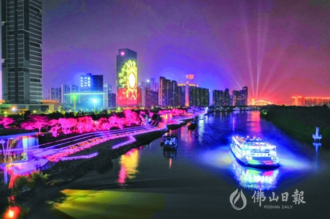 三龍灣游船行經(jīng)流光溢彩的東平水道龍舟廣場(chǎng)段。/佛山日?qǐng)?bào)記者張弘弢攝