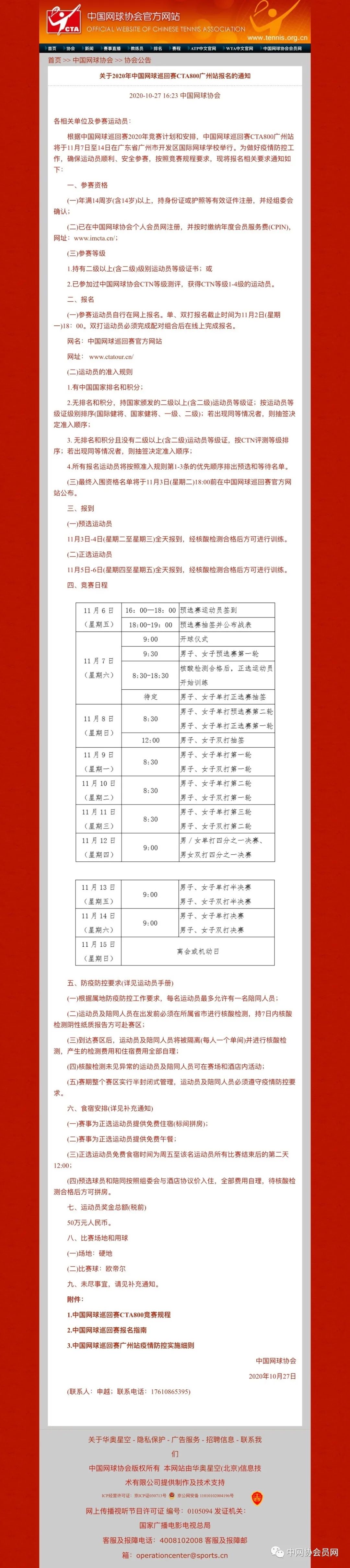 根據(jù)中國(guó)網(wǎng)球巡回賽2020年競(jìng)賽計(jì)劃和安排,中國(guó)網(wǎng)球巡回賽CTA800廣州站將于11月7日至14日在廣東省廣州市開發(fā)區(qū)國(guó)際網(wǎng)球?qū)W校舉行。單、雙打報(bào)名截止時(shí)間為11月2日(星期一)18:00。