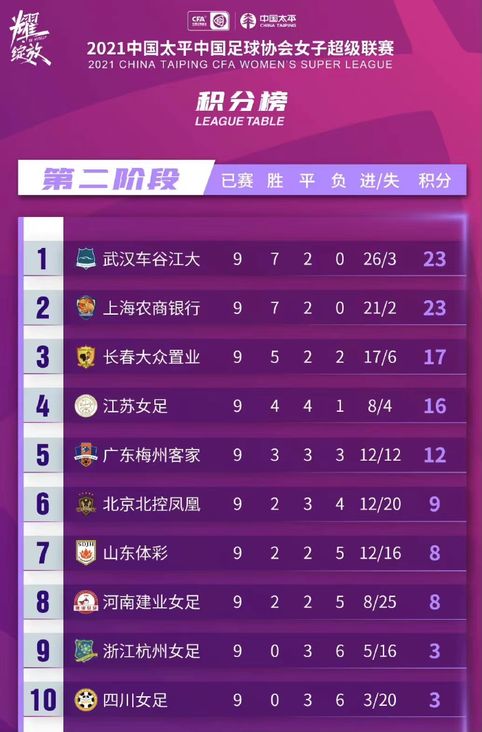 本賽季女超第三階段的比賽,積分榜前5的球隊參加爭冠組的比賽,而后5名的球隊則參加保級組的角逐,進而決出本賽季女足的最終排名。