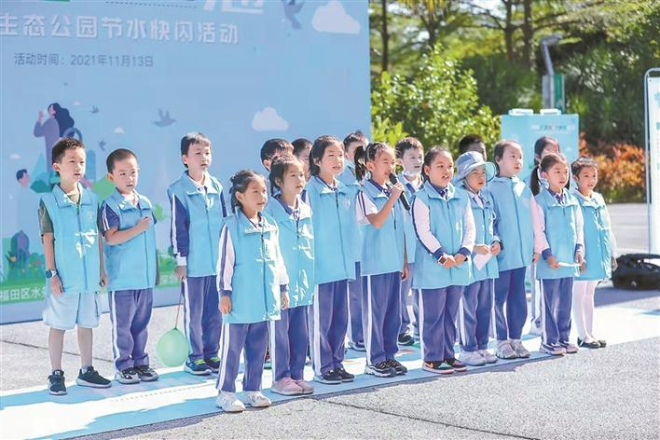 福田紅樹(shù)林生態(tài)公園是一個(gè)集科普教育、生態(tài)休閑等功能為一體的生態(tài)公園,在設(shè)計(jì)、施工、運(yùn)維全過(guò)程踐行了海綿理念的海綿型公園,同時(shí)也是節(jié)水型公園?;顒?dòng)現(xiàn)場(chǎng)布置了醒目的宣傳背板及節(jié)水知識(shí)宣傳資料,參與者在工作人員的引導(dǎo)下共同宣誓,喊出響亮的節(jié)水口號(hào),并完成協(xié)作游戲樹(shù)立節(jié)水護(hù)水的良好意識(shí)。表演環(huán)節(jié)中,孩子們獻(xiàn)上精彩合唱,將現(xiàn)場(chǎng)氣氛推向高潮。