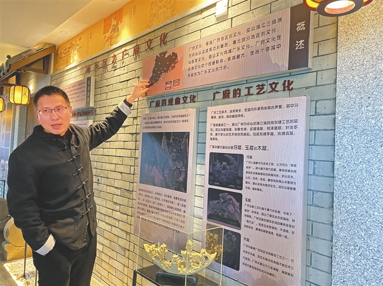 雷鋼榮向記者介紹餐廳中的文旅元素以及板芙鄉(xiāng)村歷史故事。
