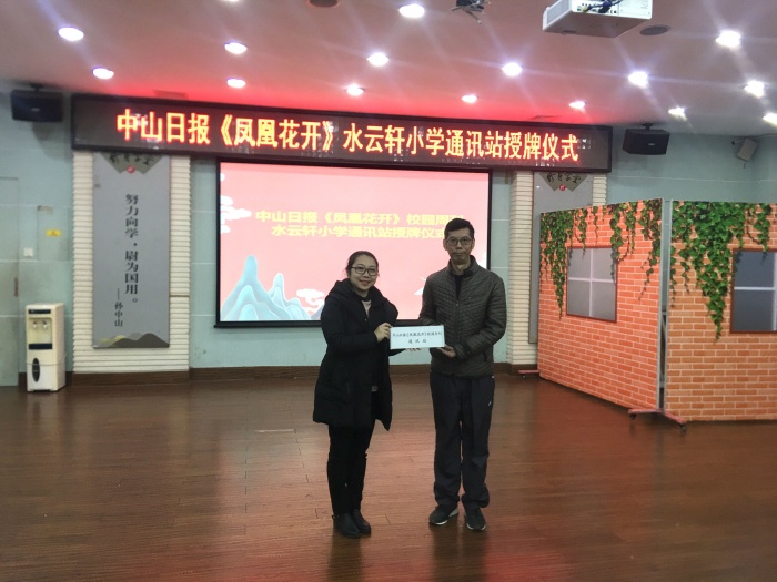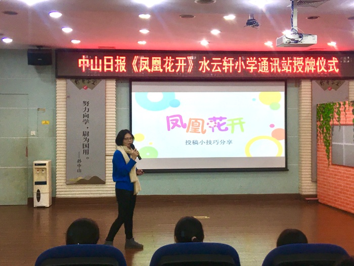 為推動(dòng)校園精神文明建設(shè),響應(yīng)廣東省中小學(xué)創(chuàng)建“書香校園”活動(dòng)的號(hào)召,豐富學(xué)生的校園文化生活,12月17日下午,中山日?qǐng)?bào)《鳳凰花開》校園??瘱|區(qū)水云軒小學(xué)通訊站掛牌儀式在多媒體教室舉行?!而P凰花開》校園專刊主編黃漢英為文學(xué)社的同學(xué)們帶來“《鳳凰花開》投稿技巧知多少”的主題講座。中山報(bào)業(yè)傳媒股份有限公司教育工作室總監(jiān)羅展新、《鳳凰花開》校園??瘷谀恐骶廃S漢英、廣東人民出版社中山出版有限公司劉婷婷編輯、校長(zhǎng)林小舟、教務(wù)處副主任徐雪華出席了本次活動(dòng),校文學(xué)社全體社員到場(chǎng)聆聽。