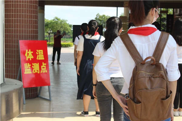 最后是學(xué)生放學(xué)離校帶隊(duì)及等候演練。模擬下午分批放學(xué)時(shí),由各班主任組織學(xué)生按照一米間距在走廊集合,分排兩路縱隊(duì)走到校門口,家長(zhǎng)們有序接孩子放學(xué)。家長(zhǎng)暫時(shí)未到的學(xué)生由班主任帶回教室等候,家長(zhǎng)到校后聯(lián)系班主任并在家長(zhǎng)緩沖區(qū)等候孩子出來(lái)。