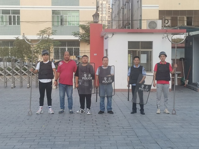 8:30,演習(xí)開始:門口有不明人員企圖混進校園,保安阻止無效,危險升級,歹徒手持菜刀,恐嚇要挾闖進校園,一名保安馬上拿起盾牌、警棍格擋,另一名老師手持鋼叉牽制,并迅速按響“一鍵警鳴”,兩名保安合力把歹徒逼到校園無人一帶,牽制歹徒,保安與老師合力把歹徒制服,危險解除,演練完畢。