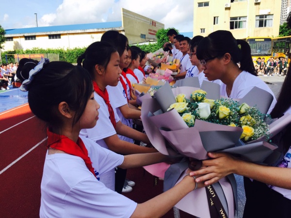 節(jié)目匯演的第一篇章是難忘母校,由六(1)和六(2)班全體學生帶來的朗誦節(jié)目《送給華盛的詩》。同學們深情地回顧了六年的小學生活,即將離開校園之際,眼含淚珠。接著王英普校長作了畢業(yè)寄語講話,向同學們表達畢業(yè)的祝賀,也祝愿同學們今后能夠走好人生路,成才報國。六(4)班全體學生帶來的手語操《感恩的心》把典禮的氛圍拉向高潮。學生代表給任課老師們送上鮮花,向老師們表達感恩之情。六(3)和六(5)班全體學生合唱的歌曲《微微》,與同學揮別,道一聲保重。
