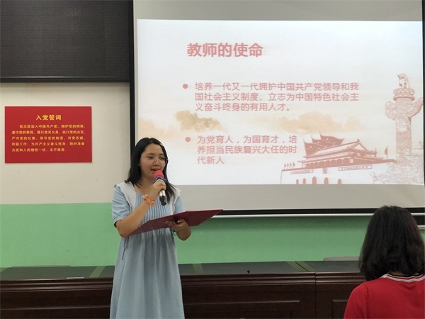 謝家潮老師的《以體育人》,講述了體育的重要性以及自身在課堂的主陣地中如何更好地育人,頻頻收獲老師們的掌聲;劉凱銀老師在演講的《牢記使命,讓青春發(fā)光》中談到,當(dāng)教師的初心是“堅(jiān)守”、“進(jìn)步”和“純粹”,她希望自己永懷初心,讓青春在奮斗中熠熠生輝;而吳雁琪老師演講《不忘初心勇?lián)?dāng),青年奮進(jìn)新時(shí)代》時(shí),語(yǔ)調(diào)慷慨激昂,讓在場(chǎng)的老師為之動(dòng)容,熱血澎湃。每位參賽選手們都圍繞對(duì)學(xué)生的“愛(ài)”展開(kāi)?!皭?ài)”源于高尚的師德,“愛(ài)”意味著無(wú)私的奉獻(xiàn),教師對(duì)學(xué)生的愛(ài),是穩(wěn)固的、深厚的,是與教師所肩負(fù)的社會(huì)責(zé)任緊密相連的,這種責(zé)任和愛(ài)能超越一切,匯聚成一股無(wú)可阻擋的力量,幫助孩子們推開(kāi)世界的門(mén)。