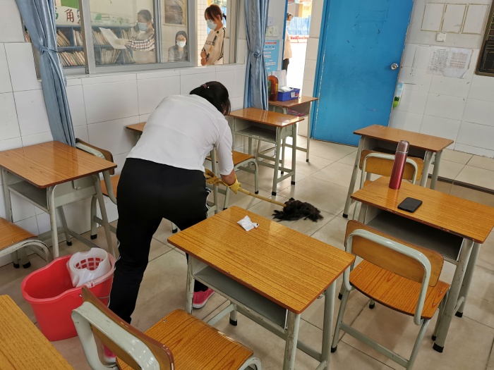 根據(jù)學(xué)校疫情防控演練方案,此次演練的重點(diǎn)是教室突發(fā)情況處置。演練開始了,上課時(shí)間,由老師扮演的學(xué)生突然頭痛、咳嗽并突然發(fā)生嘔吐,班主任和全體學(xué)生立即戴上口罩,班主任安排嘔吐學(xué)生用紙巾清潔嘴巴、戴好口罩留在教室,并組織其他學(xué)生有序排隊(duì)從前后門撤離到學(xué)校大堂通風(fēng)處。隨即,班主任聯(lián)系學(xué)校值日行政,學(xué)校啟動疫情防控應(yīng)急處置預(yù)案。清潔阿姨使用消殺工具對突發(fā)情況班級及走廊進(jìn)行全面清理消毒。緊接著,班主任將嘔吐學(xué)生帶到臨時(shí)觀察區(qū)等候,電話聯(lián)系家長了解學(xué)生具體情況,并通知帶學(xué)生到醫(yī)院看病。