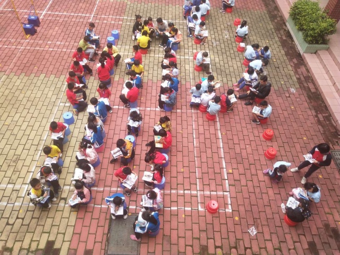 活動期間,首先在學(xué)校舉行書展,學(xué)校一千多名師生共同走進(jìn)書香世界,在知識的海洋里徜徉。根據(jù)學(xué)校安排,每節(jié)課都會由老師帶領(lǐng)不同的班級到書展現(xiàn)場。無論課間還是上課,我們都能聽到歡呼雀躍的孩子們興高采烈地奔往書展現(xiàn)場。書展現(xiàn)場更是常常里三層外三層地圍滿了天真可愛的孩子們。