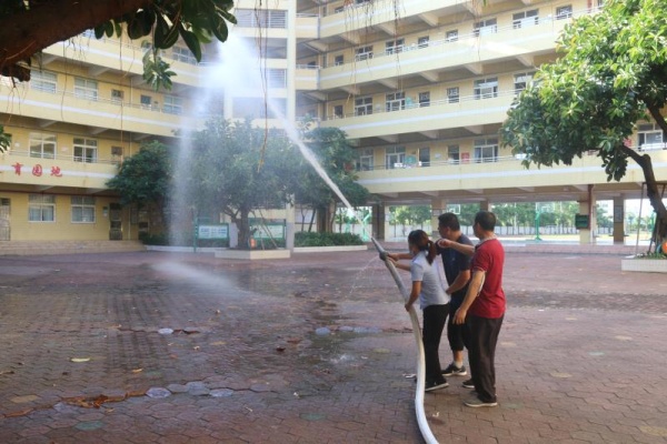 消防安全工作不僅要掌握理論知識,更重要的是進行實際操作。為了提高職工的實際消防操作能力,培訓班還安排在學校教學樓前的空曠地進行滅火實操訓練。黃富榮給大家演示正確使用滅火器進行滅火以及正確使用消防栓的實操示范,然后讓每個后勤職工進行實際操作訓練。