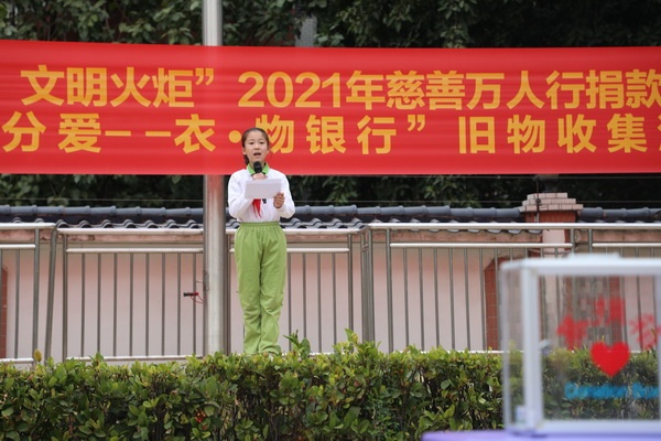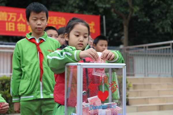 愛心捐款儀式上,五年(3)班全體學(xué)生首先表演了《少年中國(guó)說》,激昂的音樂迅速點(diǎn)燃現(xiàn)場(chǎng)氣氛。隨后,學(xué)生代表?xiàng)畈申客瑢W(xué)宣讀倡議書:扶危救困,樂善好施是中華民族的傳統(tǒng)美德,向善、為善、揚(yáng)善是人類最動(dòng)人的品質(zhì)。作為中山人,要積極宣揚(yáng)孫中山先生“博愛”精神,關(guān)心和幫助困難同學(xué),獻(xiàn)出自己力所能及的一份愛心,伸出溫暖的雙手,向有需要的困難群眾送出關(guān)懷。伴隨著《愛的奉獻(xiàn)》的音樂,各班學(xué)生代表手持班級(jí)善款,秩序井然地走向捐款箱,一份份愛心伴隨著一個(gè)個(gè)沉甸甸的信封放入箱里。