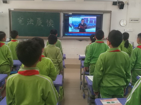 憲法日當天早上,學(xué)校組織各班級開展了“讀憲法、學(xué)憲法、懂憲法、爭做守法小公民”主題學(xué)習(xí)活動。全體學(xué)生在老師的帶領(lǐng)下觀看教育部在北京舉辦的“憲法晨讀”活動,并學(xué)習(xí)了《中華人民共和國憲法》第一條、第二條、第五條……第四十六條、第五十四條等重要內(nèi)容。在各班主任老師的領(lǐng)誦下,伴隨著朗朗的誦讀聲,師生們深深地感受到憲法作為國家根本大法的神圣不可侵犯性。