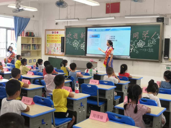 在校園宣傳大使的引領(lǐng)下,孩子們來到班級(jí)到指定位置就坐,爸爸媽媽們離開孩子參加新生家長(zhǎng)培訓(xùn)。待正副班主任清點(diǎn)完人數(shù)后,由校園宣傳大使進(jìn)行校園一日常規(guī)和十有課堂等規(guī)范進(jìn)行宣講。緊接著,孩子們排好隊(duì)伍,宣傳大使帶領(lǐng)小朋友們熟悉校園。