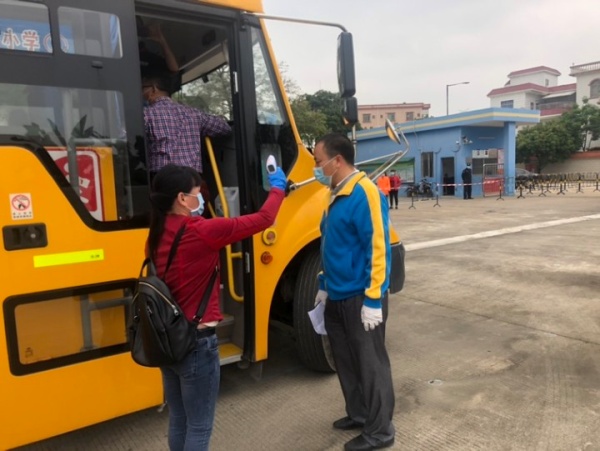 演練堅持“演練即是實戰(zhàn)”的要求,落實落細(xì)各項措施。陸銳勛校長為本次演練的總指揮。本次演練分為7個場景。場景一:排隊進入校門。24個班主任扮演學(xué)生,分2路縱隊從刷卡口進入。場景二:監(jiān)測體溫,學(xué)生排成2路縱隊,馮培有、吳宇恒、負(fù)責(zé)測量學(xué)生體溫,體溫正常方可入校。學(xué)生間隔1米排隊依次接受檢測;體溫正常者直接回教室,不要停留。假如發(fā)現(xiàn)有學(xué)生出現(xiàn)發(fā)燒癥狀(體溫37.3℃)值日行政馬上請她到臨時觀察室休息,通知該班主任打電話叫家長把孩子送到民眾醫(yī)院發(fā)燒門診部就診。場景三:課室上課,學(xué)生到班后,班主任對學(xué)生詢問“三史”,確認(rèn)無異常后,前往課室準(zhǔn)備上課。在上課期間發(fā)現(xiàn)學(xué)生提出身體不適,經(jīng)簡單詢問和測量體溫,如有發(fā)燒立刻打電話給梁兆元,曾國恒帶學(xué)生離開課室,到臨時觀察室。對全班學(xué)生逐一進行體溫檢測,確認(rèn)均無異常后,由上課老師帶領(lǐng)學(xué)生由疏散專用通道離開,到備用課室上課。梁兆元通知消毒員對課室周邊及專用通道進行消毒處理。場景四:臨時觀察室,吳文興由專門通道將身體不適的學(xué)生帶到臨時觀察區(qū),用水銀溫度計進行腋下測量該生體溫,發(fā)現(xiàn)確實偏高,立刻致電班主任并由班主任聯(lián)系家長在校門口等候,接該學(xué)生前往民眾醫(yī)院看病。假如學(xué)生有嘔吐,由曾國恒老師處理嘔吐物。梁兆元通知消毒員對臨時觀察區(qū)進行消毒處理。場景五:學(xué)習(xí) “七步洗手法”,1、所有班主任回教室坐好,由張容冰教大家學(xué)習(xí)“七步洗手法”。2、所有班主任扮演學(xué)生上廁所后洗手。場景六:學(xué)生上下樓梯,學(xué)生靠兩邊有序上下樓梯,間隔1米,后面的同學(xué)排隊,間隔1米。場景七:學(xué)生上體育課,1、學(xué)生分批在教室門前排兩路縱隊,間隔4塊地板磚,整理好隊伍后有序的向運動場走去,接著第2批。