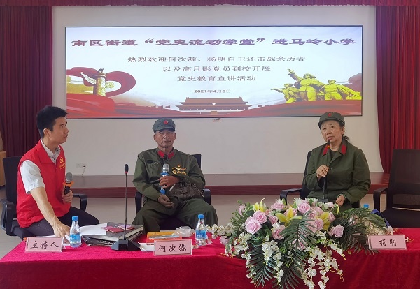 ——南區(qū)街道黨史教育百姓宣講暨“紅色印記”南區(qū)黨群故事分享活動(dòng)到馬嶺小學(xué)發(fā)布時(shí)間:2021-04-07 12:59 信息來源:本網(wǎng)站 瀏覽次數(shù):0