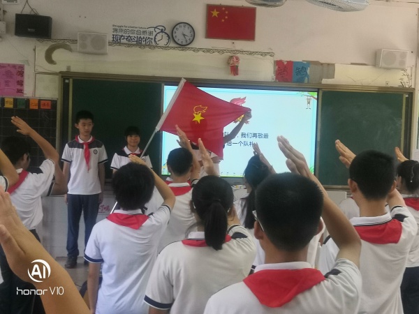 接著,全體隊員重溫入隊誓詞,由離隊隊員代表初二(8)班白軒怡同學發(fā)言,她說:“回顧在少先隊的日子,是難忘而快樂的。忘不了在入隊儀式上,我們莊嚴的宣誓;忘不了那已行過無數(shù)次的少先隊隊禮;忘不了那已在胸前佩戴過無數(shù)次的鮮艷的紅領巾……"