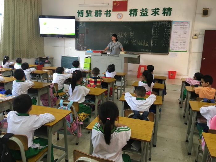 課堂上教師寓教于樂,扎實開展環(huán)保教育,教師通過豐富多樣的方式為學生傳授垃圾分類知識,讓學生了解垃圾分類的好處。有的班級教師以提問、小游戲等多種教學手段,生動地為學生們展現(xiàn)如何區(qū)分可回收垃圾、有害垃圾、廚余垃圾、其他垃圾;有的班級教師以實際事例向?qū)W生展示如何讓“廢物”得以再利用;有的班級整個教室充滿了歡聲笑語,學生的注意力被幻燈片里生動形象、充滿童趣的垃圾分類知識講解所吸引,他們聚精會神觀地聽教師宣講……