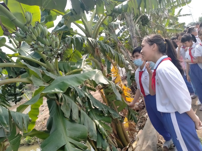 同學(xué)們帶著好奇和興奮走進(jìn)農(nóng)田,清新的空氣讓他們神清氣爽。在農(nóng)田中,同學(xué)們聚精會(huì)神地聽(tīng)農(nóng)民伯伯介紹香蕉、辣椒、豆角等農(nóng)作物的生長(zhǎng)條件、種植方法以及生長(zhǎng)過(guò)程等農(nóng)業(yè)知識(shí)。同學(xué)們驚訝,原來(lái)生活中常見(jiàn)的蔬菜瓜果要經(jīng)過(guò)如此精心的照料才能端上家中的飯桌,小小的蔬菜瓜果的背后凝聚了農(nóng)民無(wú)數(shù)的辛勤汗水。