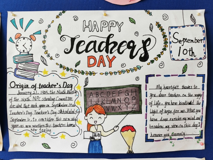 這次英語作品展覽收集了五、六年級的手抄報和書法作品,同學們利用周末時間,用自己豐富的想象力,創(chuàng)造了一幅幅五彩繽紛、可愛斑斕的精美作品。五、六年級的孩子正處于愛畫,愛想象,愛英語學習的階段。這樣一種形式能夠激發(fā)學生學習英語的興趣,積累各種節(jié)日文化知識,通過動手動腦,設計構(gòu)思在紙張上,孩子們更樂于運用閱讀和生活中學到的英語,把平時積累的好詞好句合理的運用到英語手抄報創(chuàng)作當中,使語言更生動形象,這樣就達到了主動查找、看、說、想、寫的有機結(jié)合。