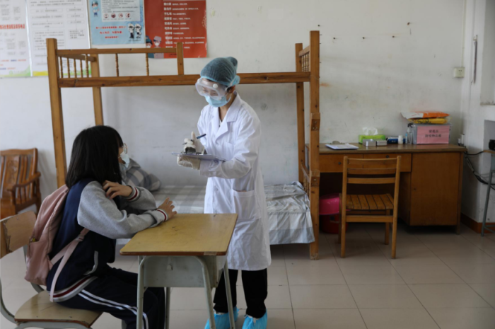 本次演練共預設了“返校入校管理”“學生就餐”“教室突發(fā)異常情況”“隔離室復查、轉(zhuǎn)運及跟蹤處置”“學校疫情防控領導小組啟動應急預案”等場景,通過現(xiàn)場情景演示,結(jié)合旁白解說的方式,將校園疫情防控工作的每一個關鍵節(jié)點形象真實地演練出來。上午九點整,溫結(jié)聯(lián)校長宣布“2021年春季新學期疫情防控演練開始”,演練按照預設流程依次進行。其中,“返校入校管理”在學校正門口進行,“學生就餐”在學校飯?zhí)眠M行,“教室突發(fā)異常情況”在教室進行,“隔離室復查、轉(zhuǎn)運及跟蹤處置”在校醫(yī)室進行。