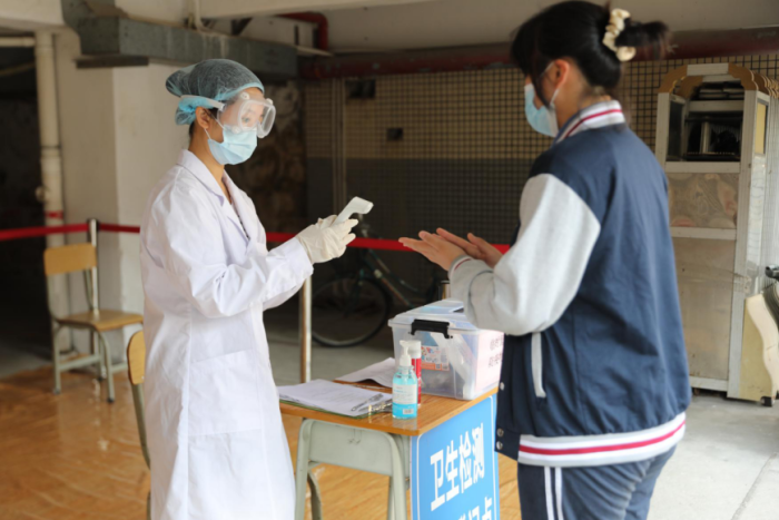 參加演練的初三(10)班的同學首先在學校正門緩沖區(qū)排隊等待返校健康篩查,負責測溫的相關人員有序為每一位學生檢測體溫,對體溫異常的學生及時安排復查。學生順利入校后,接著進行了教師入校、外來人員入校兩個情況的演練。隨后,參加演練的全體人員來到學生飯?zhí)眠M行學生就餐演練,從排隊測溫、洗手、取餐、用餐到用餐完畢,每一個環(huán)節(jié)都有序而規(guī)范?!敖淌彝话l(fā)異常情況”的演練中,參加演練的師生按照預設的流程完成了對突發(fā)情況的處理,從詢問、判斷、疏散隔離、醫(yī)務人員介入、跟蹤處置到應急預案啟動,整個過程緊張而有序。