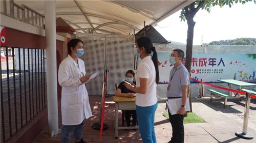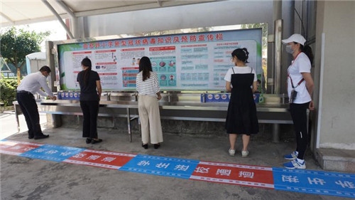 下午3時,全體教職工戴著口罩,在校門口依次排開,演練開始。門衛(wèi)、值日行政謝萬明、值日教師徐稱阜、校醫(yī)對入校“學(xué)生”體溫測量,測量體溫合格后,“學(xué)生”前后相間一米成一路縱隊,安靜有序地步行到教學(xué)樓前的洗手池,洗手后進入教室。發(fā)現(xiàn)體溫異常并伴有咳嗽癥狀“學(xué)生”,校醫(yī)立即將其轉(zhuǎn)移至校門口的臨時隔離區(qū),做好心理安撫。按照應(yīng)急預(yù)案流程,用水銀溫度計復(fù)核體溫,做好流行病史等記錄,馬上上報校長......
