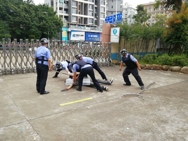 先由派出所民警現(xiàn)場技術(shù)指導(dǎo)學(xué)校保安當(dāng)有“暴恐分子”沖進學(xué)校時,該如何運用鋼叉、盾牌對暴恐分子進行攔截。鋼叉可以用來勾腿、叉脖子、叉住腰,配合防暴盾牌非常有威懾力。在民警的耐心指導(dǎo)之后,石岐第一小學(xué)的保安們開始進行情景練習(xí),當(dāng)出現(xiàn)暴徒時如何更迅速有效地行動。多次練習(xí)后保安們逐漸掌握了有效制服暴徒的技巧。后在演練過程中,保安人員反應(yīng)迅速、手持防暴棍、鋼叉集中與 “暴徒”周旋,配合默契,采取處置措施及時、合理,表現(xiàn)出良好的處理危機事件的能力。