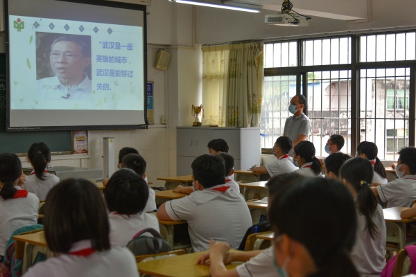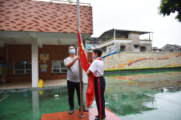 “復(fù)學(xué)第一課”,由陳惠良主任主持。首先是特別的升旗儀式。新學(xué)期第一面國(guó)旗,由六2班趙泳瑜爸爸趙權(quán)輝升起,趙權(quán)輝叔叔在疫情期間,一直堅(jiān)持參加石岐區(qū)的志愿活動(dòng),他是一位熱心家長(zhǎng),學(xué)校哪里需要幫忙,哪里就有他的身影。伴隨著國(guó)歌緩緩響起,同學(xué)們莊嚴(yán)佇立,趙權(quán)輝的高大形象深深地印在了同學(xué)們的心中……
