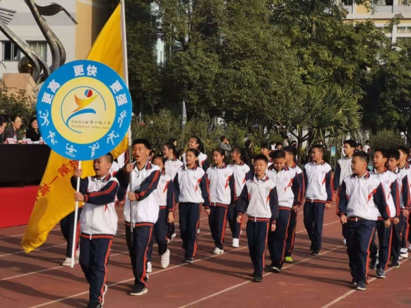 開(kāi)幕式上,伴隨著鏗鏘有力的《運(yùn)動(dòng)員進(jìn)行曲》,裁判員代表隊(duì)、各校運(yùn)動(dòng)員代表隊(duì)依次入場(chǎng)。第一城小學(xué)的運(yùn)動(dòng)員們昂首闊步,邁著整齊的步伐,個(gè)個(gè)精神飽滿、神采奕奕,臉上洋溢著自信的笑容,展現(xiàn)了青少年朝氣蓬勃的精神風(fēng)貌和“健康向上”的體育精神。