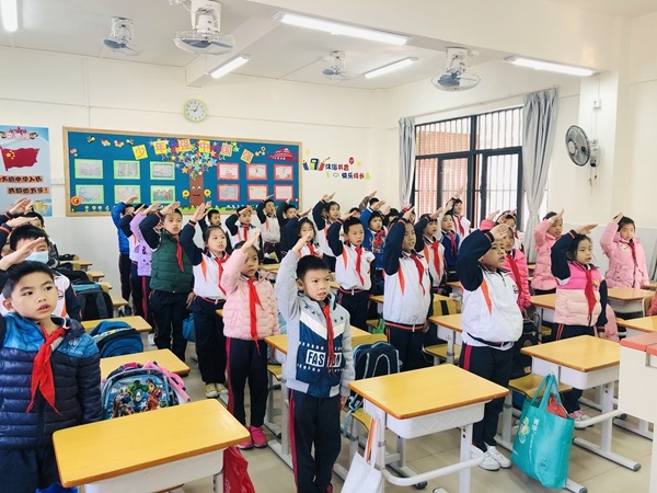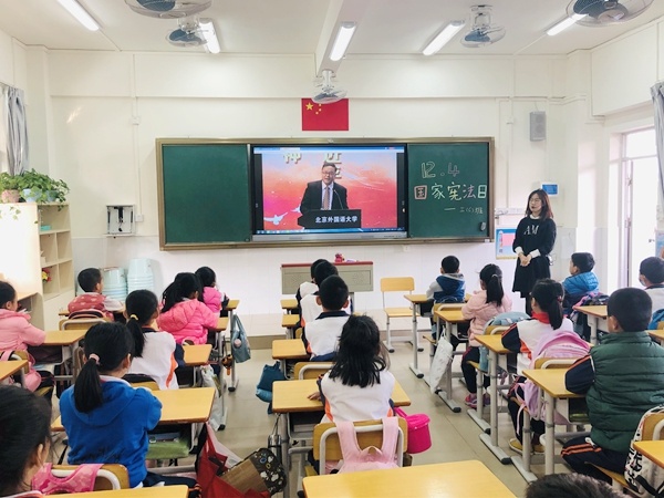 在學(xué)校的統(tǒng)一組織下,第一節(jié)課的下課鈴聲響起,各班班主任回到班級,打開多媒體平臺收看網(wǎng)絡(luò)直播,并且板書活動主題“12?4國家憲法日”。緊接著,全體學(xué)生室內(nèi)起立,面向國旗,跟唱國歌,參加全國的升旗儀式。而后,全體師生共同觀看“憲法晨讀”活動,并且同步跟讀相關(guān)憲法法律知識。