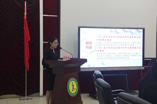 第三議程是課題中期匯報。由課題主持人司徒詠老師代表課題組成員在二樓教師會議室作課題研究中期匯報。司徒詠老師的發(fā)言自信大方、鏗鏘有力,主要從研究背景、目標、內(nèi)容、思路、方法、課題創(chuàng)新之處、中期成果等方面向與會專家、領(lǐng)導(dǎo)和老師們作了詳盡的匯報。在匯報中,她指出本課題研究始終把激發(fā)學(xué)生英語閱讀興趣,提升學(xué)生英語閱讀能力和英語思維能力放在重要位置,努力打造有特色的單元整體視角下的閱讀教學(xué)。同時,她也提出了她對此課題研究的疑難困惑和后期展望。