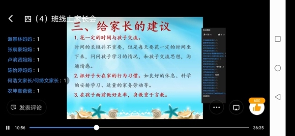 線上家長會中,各班級各科任老師根據自身的任教科目做好詳盡的課件以幫助家長更好地了解孩子近段時間以來的學習情況,對表現(xiàn)優(yōu)異的同學進行鼓勵和表揚,激勵同學們保持積極向上的學習態(tài)度。同時,向家長提出各種建議或者方法以引導家長培養(yǎng)孩子的學習行為習慣。如建立合理的學習計劃,勞逸結合;通過親子活動增進親子感情等等。與此同時,班主任們積極引導家長如何在疫情期間建立親子關系,引導孩子如何進行線上學習,使得孩子的聽課效率更上一層樓。更是強調家長應當密切關注孩子的心理變化,加強對孩子的心理疏導與監(jiān)管,關注安全教育、勞動教育等等。