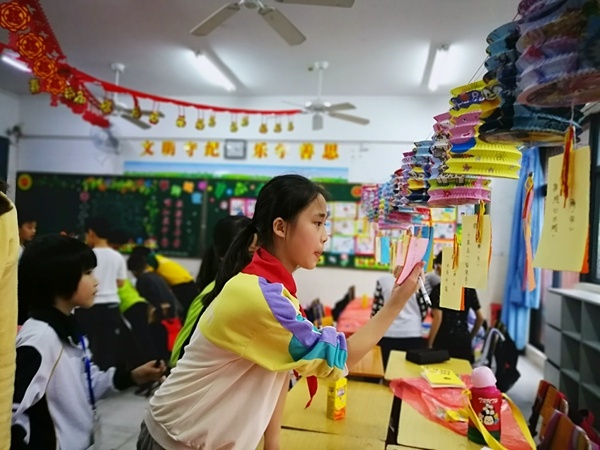 升平學(xué)子不僅手工了得,腦力功夫也值得一提。猜燈謎,鬧元宵的必備環(huán)節(jié),在升平小學(xué)課室里早已“鬧”起來(lái)了。紅繩牽起的燈謎,也牽住了孩子們的思考??吹胶⒆觽儾夭蛔〉男δ?,溢出畫(huà)面的歡樂(lè),讓人忍不住想加入其中。