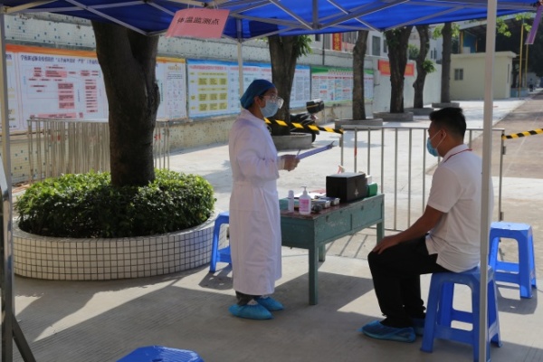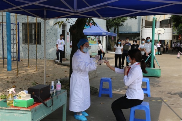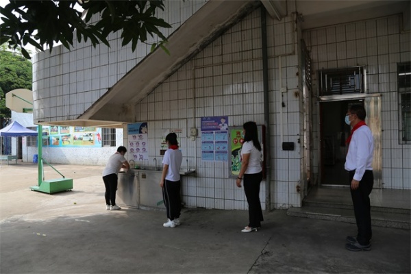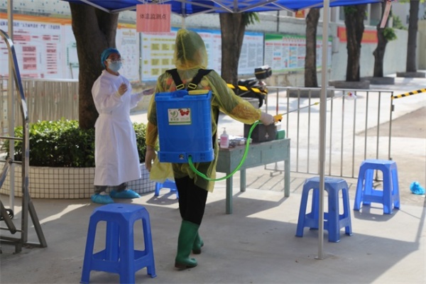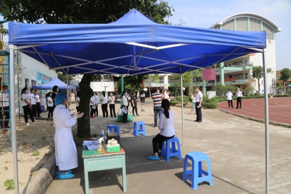 如果,檢測組發(fā)現(xiàn)有體溫異常的學(xué)生,將由值日老師帶學(xué)生到臨時處理點向值日行政報告,值日行政將學(xué)生帶至校門旁臨時處置點向校醫(yī)告知情況,途中不得與任何人接觸,兩人相隔一米距離,校醫(yī)示意學(xué)生站在臨時處置點外的指定區(qū)域,用噴霧消毒液對發(fā)熱學(xué)生進行消毒,消毒完畢后,學(xué)生進入處置點。校醫(yī)取出水銀體溫計給學(xué)生測量腋溫;并詢問學(xué)生相關(guān)信息,做好記錄。隨后致電現(xiàn)場處置組長蔡春燕副校長說明相關(guān)情況,由其向校長匯報。待校醫(yī)用水銀體溫計測量學(xué)生體溫結(jié)果顯示正常,學(xué)生可進校園回課室正常上課,離開后,學(xué)校消毒防疫組對臨時處置點進行消毒。