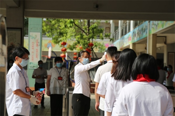 安全保衛(wèi)組老師先將入校通道進行消毒,接著和值日老師引導(dǎo)學(xué)生按指定專屬通道排隊,學(xué)生前后保持一米距離,有序進入測溫區(qū),入校通道上按照一米的間隔貼著地貼,學(xué)生踩著地貼排隊等待,檢測組老師對學(xué)生依次進行全身消毒,并進行體溫檢測,體溫正常的學(xué)生迅速按指定通道入校。