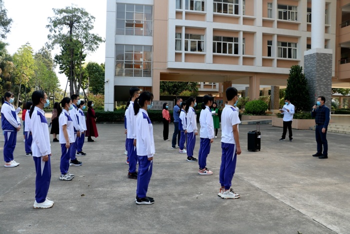 演練場景一,隨著現(xiàn)場總指揮陳清茂校長宣布“演練開始”,60多名師生在值日行政領(lǐng)導(dǎo)的指揮下,戴著口罩在校門口集合點(diǎn)模擬“師生進(jìn)校門測量體溫”情境,以及發(fā)現(xiàn)學(xué)生體溫偏高的應(yīng)急處置流程。演練場景二,模擬課堂上突發(fā)學(xué)生出現(xiàn)身體不適(發(fā)燒并伴有咳嗽、胸悶等癥狀)應(yīng)急處置流程,以及如何啟動《中山市永寧中學(xué)新冠肺炎疫情應(yīng)急處置預(yù)案》情境。參加演練師生們非常認(rèn)真,嚴(yán)格按照疫情防控操作流程進(jìn)行,應(yīng)急處置演練規(guī)范,師生們熟悉疫情防控知識和應(yīng)急處置操作流程。