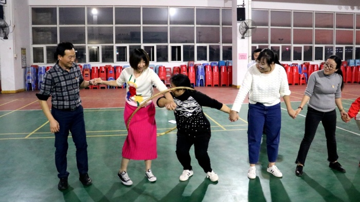 運(yùn)動會設(shè)10人定點(diǎn)投籃、20人呼啦圈、11人飛環(huán)三個趣味項(xiàng)目,分年級進(jìn)行比賽。全校教職工踴躍參與,各年級挑選精壯人員輪流上場。每個項(xiàng)目不僅可以鍛煉大家動手動腦的能力,更是鍛煉教職工們在工作中團(tuán)結(jié)協(xié)作的精神,是智慧和體力的角逐,也是團(tuán)結(jié)協(xié)作的完美比拼。整個體育館處處都是驚喜與喝彩,演繹著永中教職工熱情、豪爽、好勝的個性,這是青春的喝彩,是幸福的笑聲 ……