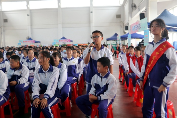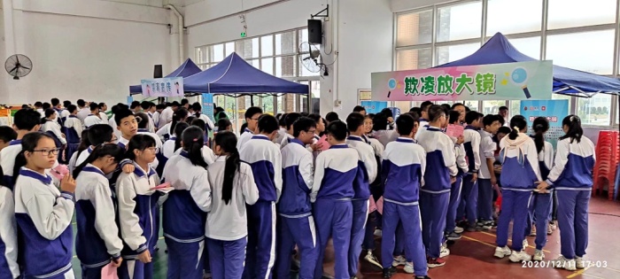 有獎(jiǎng)互動(dòng)游戲融知識(shí)性、趣味性和體驗(yàn)性,共設(shè)置七個(gè)游戲攤位:法制宣傳欄、視像宣傳、案例介紹、欺凌放大鏡、永寧“三分王”、安“圖”生、飛躍XY等。在永寧社區(qū)志愿者和永寧中學(xué)學(xué)生志愿者的引導(dǎo)、講解下,初二級(jí)的同學(xué)們積極參與,踴躍答題,現(xiàn)場(chǎng)氣氛十分熱烈。