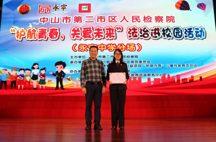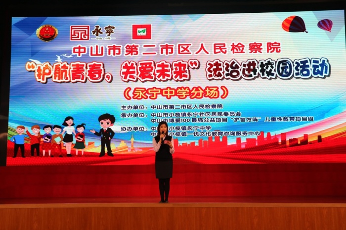 12月11日下午,中山市第二市區(qū)人民檢察院在中山市永寧中學(xué)體育館舉辦“護(hù)航青春,關(guān)愛未來”的法治進(jìn)校園活動(dòng)。此次活動(dòng)由中山市第二市區(qū)人民檢察院主辦,小欖鎮(zhèn)永寧社區(qū)居委會(huì)、永寧中學(xué)承辦,小欖鎮(zhèn)一優(yōu)文化教育咨詢服務(wù)中心協(xié)辦。參與本次活動(dòng)的領(lǐng)導(dǎo)嘉賓有:中山市第二市區(qū)人民檢察院第三檢察部副主任、一級(jí)檢察官龔登峰先生、二級(jí)檢察官鄧艷女士、永寧社區(qū)黨委副書記劉琴女士、永寧社區(qū)黨委、居委會(huì)布寶文委員、以及永寧社區(qū)團(tuán)委、婦聯(lián)相關(guān)領(lǐng)導(dǎo)、學(xué)校領(lǐng)導(dǎo)和初二級(jí)540多名師生共同參與了本次活動(dòng)。