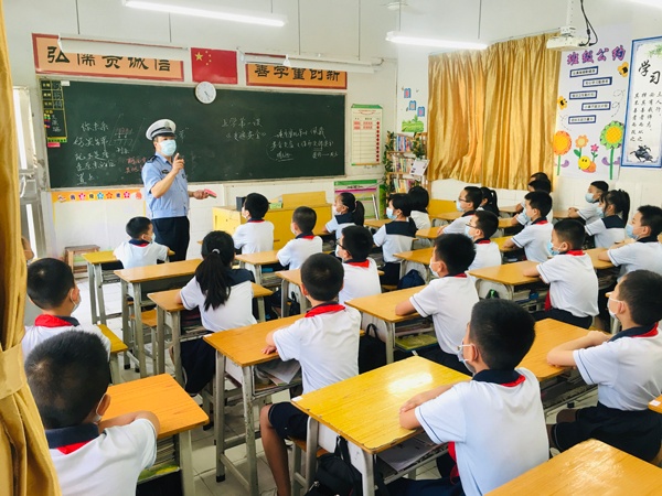 首先,朱指導員為返校學生帶來了一堂生動的交通安全教育課。在課堂上,朱指導員從乘坐摩托車要佩戴安全頭盔、乘車要系安全帶、家長騎電動車要選擇合標車等方面對學生進行了詳細的講解。上完課后,朱指導員還為同學們發(fā)放了交通安全宣傳單,讓大家將交通安全知識帶回家。