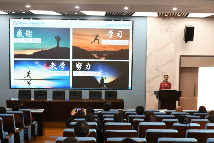 喻的的老師分享的主題《發(fā)揮‘三?!瘢瑺巹?chuàng)中考優(yōu)異成績》。喻老師提到作為一名老師要不斷地學習,自我改變、自我成長,活到老,學到老,人要像竹子,不斷突破自己;在教學方面要用實干篤定前行,幫助學生打牢基礎知識,努力拓展學生的知識面;面對中考將準備好兩顆心:決心和信心,將發(fā)揚“三牛”精神,以牛勁牛力創(chuàng)造中考優(yōu)異成績!