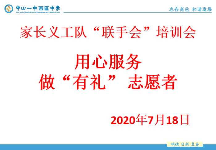 炎炎夏日,中山市創(chuàng)建第六屆全國文明城市工作進(jìn)入攻堅沖刺階段。為進(jìn)一步推動中山一中西區(qū)中學(xué)家長志愿服務(wù)活動的深入開展,提高志愿服務(wù)整體水平,確保志愿服務(wù)工作在暑假期間的常態(tài)化,打造一支高素質(zhì)的家長志愿者隊伍,7月18日上午及7月22日晚上,學(xué)校分年級組織家長志愿者開展主題為“用心服務(wù),做‘有禮’志愿者”的專題培訓(xùn)。