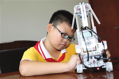 盛藝承擺弄自己發(fā)明的機(jī)器人。