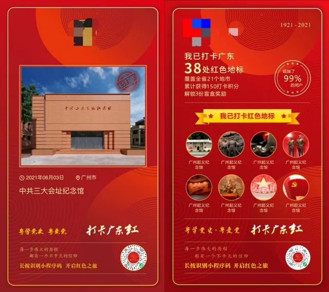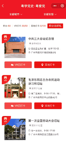 廣大黨員干部群眾隨時隨地拿起手機掃描二維碼或在微信小程序搜索“打卡廣東紅”,即可進入頁面,通過線上或線下實地打卡等方式,馬上進入上百個重要地標、重要革命遺址、重大事件發(fā)生地、革命紀念館等參觀學習,或看或聽,或進或出,輕松自如。