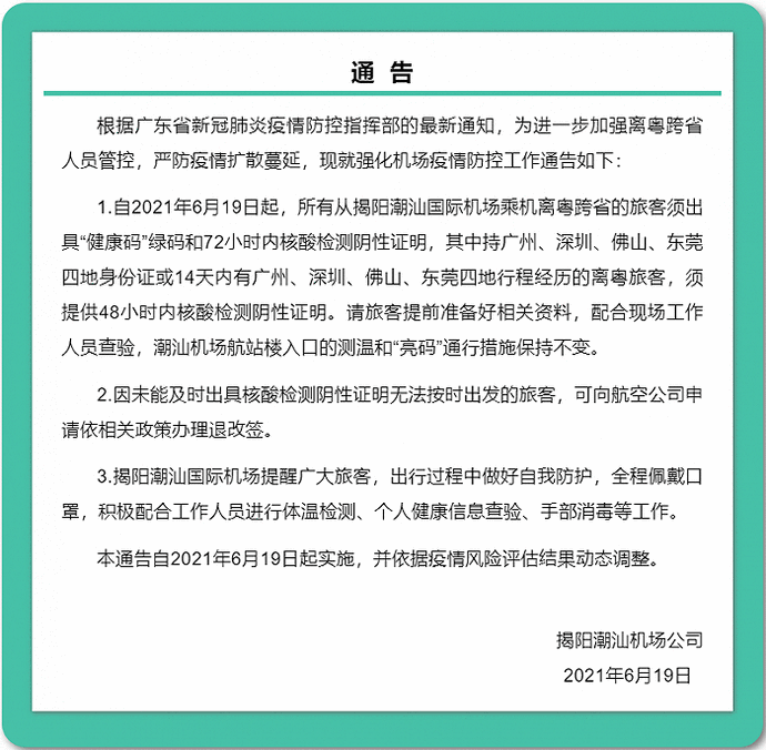 據(jù)“揭陽發(fā)布”微信公眾號消息,揭陽潮汕機場公司發(fā)布通告,6月19日起,所有從揭陽潮汕國際機場乘機離粵跨省的旅客須出具“健康碼”綠碼和72小時內(nèi)核酸檢測陰性證明,其中持廣州、深圳、佛山、東莞四地身份證或14天內(nèi)有廣州、深圳、佛山、東莞四地行程經(jīng)歷的離粵旅客,須提供48小時內(nèi)核酸檢測陰性證明。請旅客提前準備好相關(guān)資料,配合現(xiàn)場工作人員查驗,潮汕機場航站樓入口的測溫和“亮碼”通行措施保持不變。